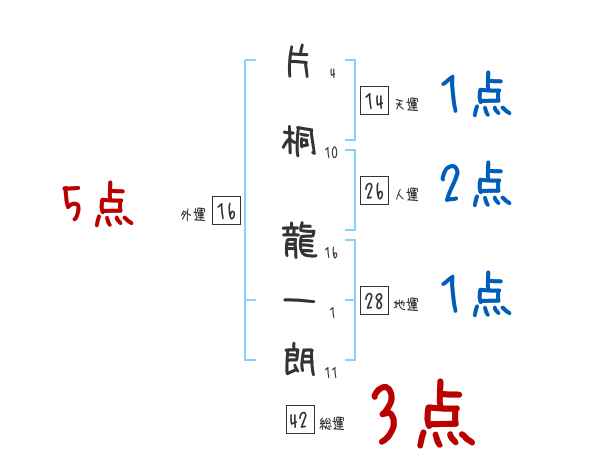 総運![]() | 片桐龍一朗さんの総運は42画の3つ星!病気に注意。多芸であるが消極的でおとなしい。 あなたの人生を表す1番重要な運勢です。生涯を通じて影響する総合運となり、主に50歳以降の晩年期に影響を及ぼします。 |