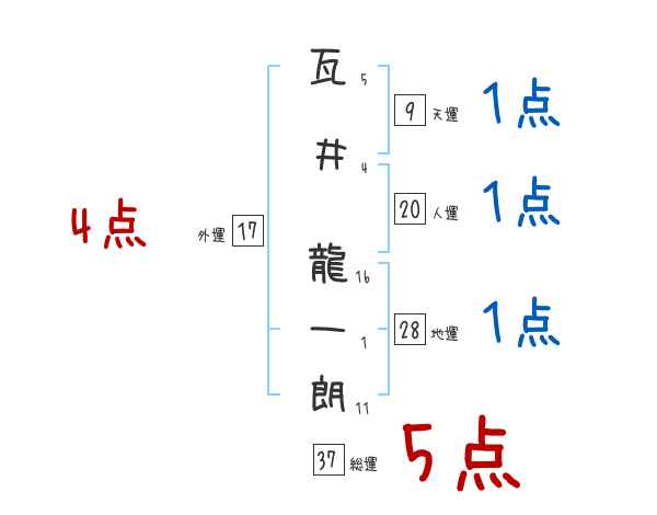 天運![]() | 瓦井龍一朗さんの天運は9画の1つ星!消極的で才能を発揮することが苦手なことも。周りの意見に耳を傾けましょう。 家系が持つ宿命的な運勢を表します。祖先から受け継いだ苗字ですので自分の力が及びません。家柄を象徴します。 |