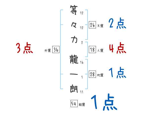 外運![]() | 等々力龍一朗さんの外運は36画の3つ星!先見性が豊かです。多少神経質で苦労することも。 生活面を象徴する運勢です。外部から受ける影響力を表し、結婚運、家庭運や職場、環境への順応性を表します。 |