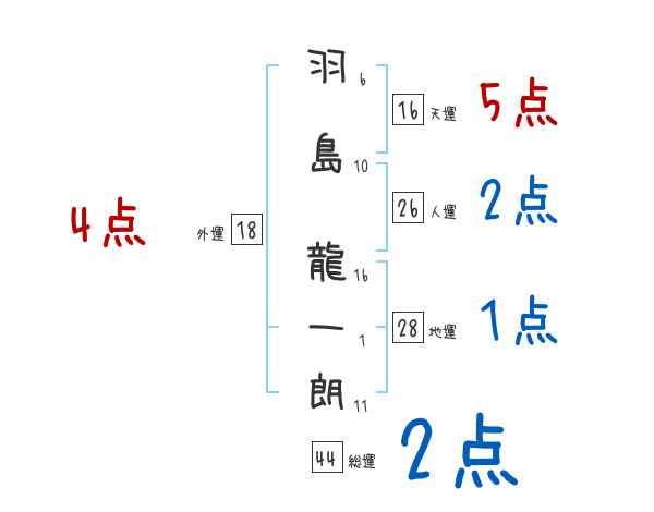 人運![]() | 羽島龍一朗さんの人運は26画の2つ星!波瀾万丈かも。信頼できる人を大事にしましょう。 性格や才能などを表す2番目に重要な運勢です。人間関係や協調性、社会的な成功に影響します。主に20歳から50歳ぐらいまでの中年期の運勢を表します。 |