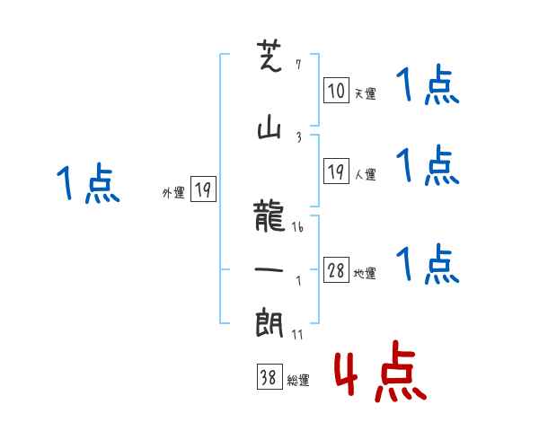 外運![]() | 芝山龍一朗さんの外運は19画の1つ星!優れた才能を持ちますが、協調性が足りないことも。周りの人と協力する事を意識しましょう。 生活面を象徴する運勢です。外部から受ける影響力を表し、結婚運、家庭運や職場、環境への順応性を表します。 |