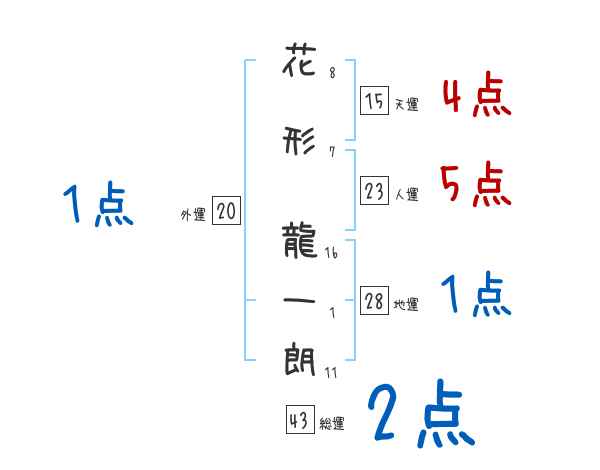 地運![]() | 花形龍一朗さんの地運は28画の1つ星!家庭環境に注意。スポーツで活躍できる能力があるかも。 個性を表す基礎的な運勢です。性格形成や対人関係、行動力など家庭環境に影響されます。主に誕生してから20歳くらいまでの若年期の運勢を表します。 |