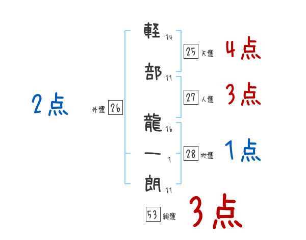 | 天運  | 軽部龍一朗さんの天運は25画の4つ星!個性があり才能があふれる。強運の持ち主で発展する。家系が持つ宿命的な運勢を表します。祖先から受け継いだ苗字ですので自分の力が及びません。家柄を象徴します。 |