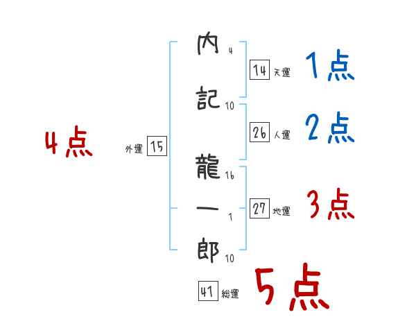 天運![]() | 内記龍一郎さんの天運は14画の1つ星!人に対して優しいがストレスを溜め込みがち。人間関係のトラブルを避けるよう気をつけましょう。 家系が持つ宿命的な運勢を表します。祖先から受け継いだ苗字ですので自分の力が及びません。家柄を象徴します。 |