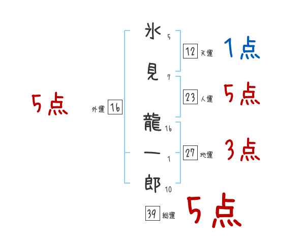 外運![]() | 氷見龍一郎さんの外運は16画の5つ星!人望が厚く大きく発展する。逆転成功が見える。 生活面を象徴する運勢です。外部から受ける影響力を表し、結婚運、家庭運や職場、環境への順応性を表します。 |