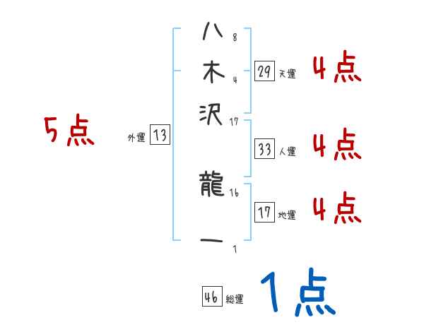 総運![]() | 八木沢龍一さんの総運は46画の1つ星!迷走することが多く苦労するかも。目先のことにとらわれないように。 あなたの人生を表す1番重要な運勢です。生涯を通じて影響する総合運となり、主に50歳以降の晩年期に影響を及ぼします。 |