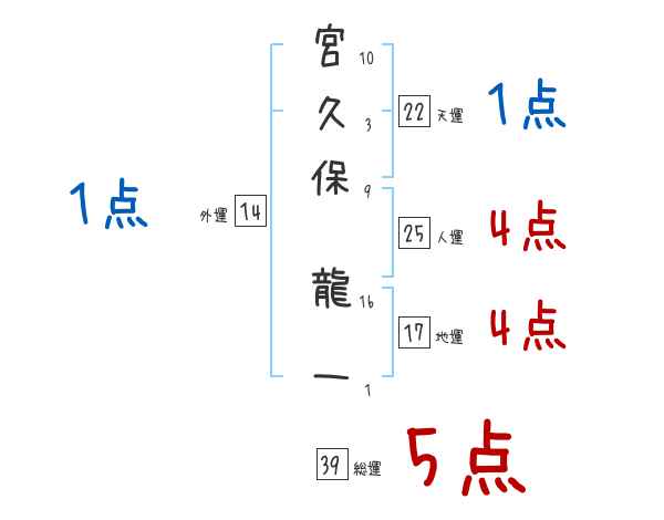 天運![]() | 宮久保龍一さんの天運は22画の1つ星!努力することが苦手ないっぽう手先が器用。芸術性にも優れる。 家系が持つ宿命的な運勢を表します。祖先から受け継いだ苗字ですので自分の力が及びません。家柄を象徴します。 |