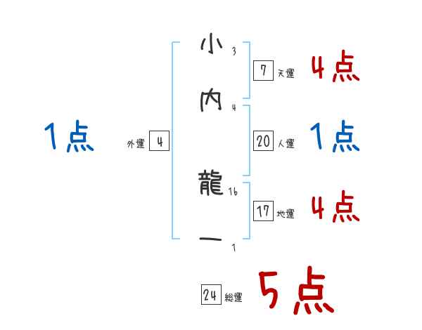 天運![]() | 小内龍一さんの天運は7画の4つ星!強い意志や信念を持ち独立心が強い。自立する。 家系が持つ宿命的な運勢を表します。祖先から受け継いだ苗字ですので自分の力が及びません。家柄を象徴します。 |