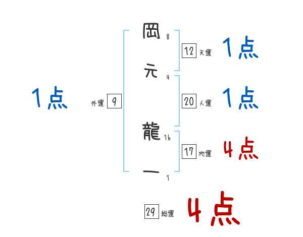 外運![]() | 岡元龍一さんの外運は9画の1つ星!消極的で才能を発揮することが苦手なことも。周りの意見に耳を傾けましょう。 生活面を象徴する運勢です。外部から受ける影響力を表し、結婚運、家庭運や職場、環境への順応性を表します。 |