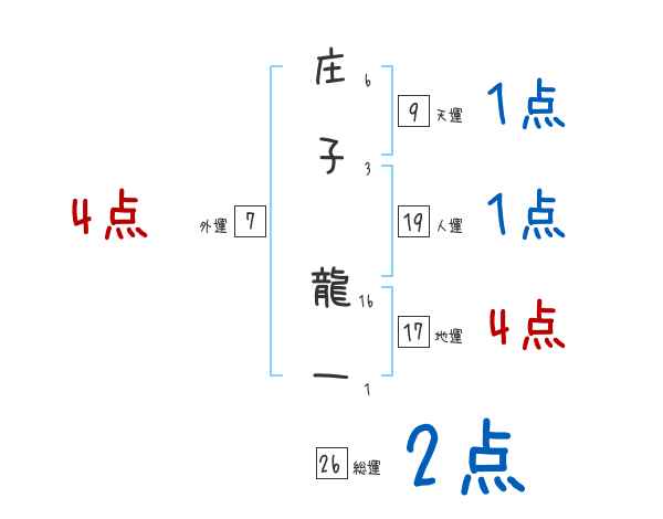 人運![]() | 庄子龍一さんの人運は19画の1つ星!優れた才能を持ちますが、協調性が足りないことも。周りの人と協力する事を意識しましょう。 性格や才能などを表す2番目に重要な運勢です。人間関係や協調性、社会的な成功に影響します。主に20歳から50歳ぐらいまでの中年期の運勢を表します。 |