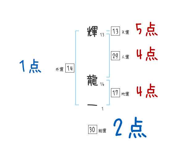 外運![]() | 輝龍一さんの外運は14画の1つ星!人に対して優しいがストレスを溜め込みがち。人間関係のトラブルを避けるよう気をつけましょう。 生活面を象徴する運勢です。外部から受ける影響力を表し、結婚運、家庭運や職場、環境への順応性を表します。 |