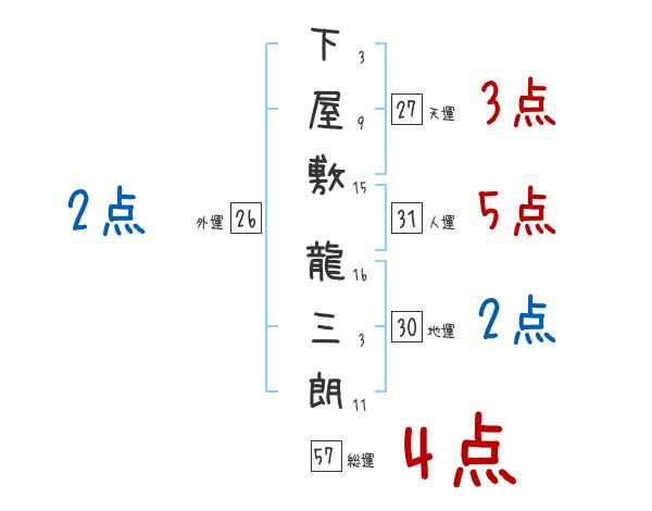 天運![]() | 下屋敷龍三朗さんの天運は27画の3つ星!頭脳明晰だが強情で摩擦が多い傾向。孤立に注意。 家系が持つ宿命的な運勢を表します。祖先から受け継いだ苗字ですので自分の力が及びません。家柄を象徴します。 |