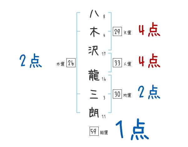 天運![]() | 八木沢龍三朗さんの天運は29画の4つ星!完全主義で才能がある。厳格な心の持ち主。 家系が持つ宿命的な運勢を表します。祖先から受け継いだ苗字ですので自分の力が及びません。家柄を象徴します。 |