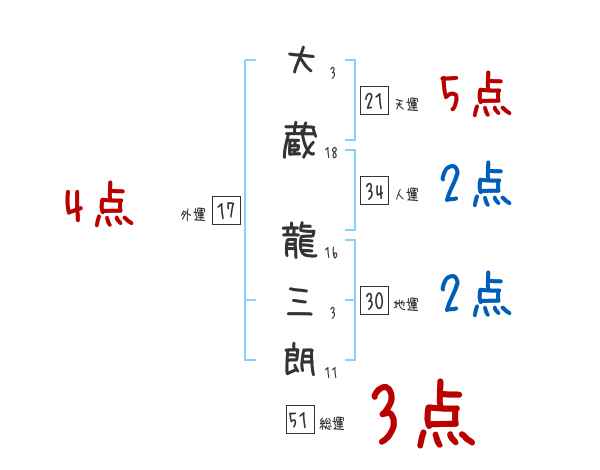 天運![]() | 大蔵龍三朗さんの天運は21画の5つ星!統率力がある。独立し成功する。名誉を手に入れる。 家系が持つ宿命的な運勢を表します。祖先から受け継いだ苗字ですので自分の力が及びません。家柄を象徴します。 |