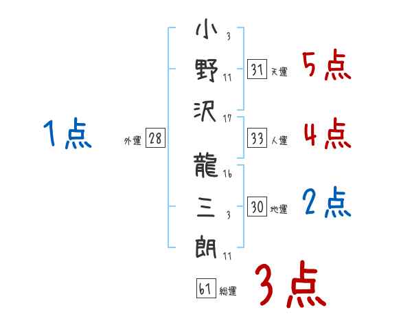 天運![]() | 小野沢龍三朗さんの天運は31画の5つ星!社交性があり判断力に優れる。順風満帆な人生で円満な生活。 家系が持つ宿命的な運勢を表します。祖先から受け継いだ苗字ですので自分の力が及びません。家柄を象徴します。 |