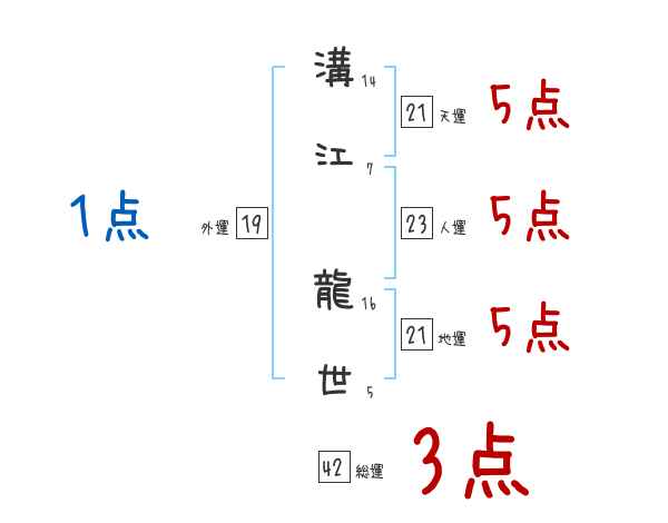 天運![]() | 溝江龍世さんの天運は21画の5つ星!統率力がある。独立し成功する。名誉を手に入れる。 家系が持つ宿命的な運勢を表します。祖先から受け継いだ苗字ですので自分の力が及びません。家柄を象徴します。 |
