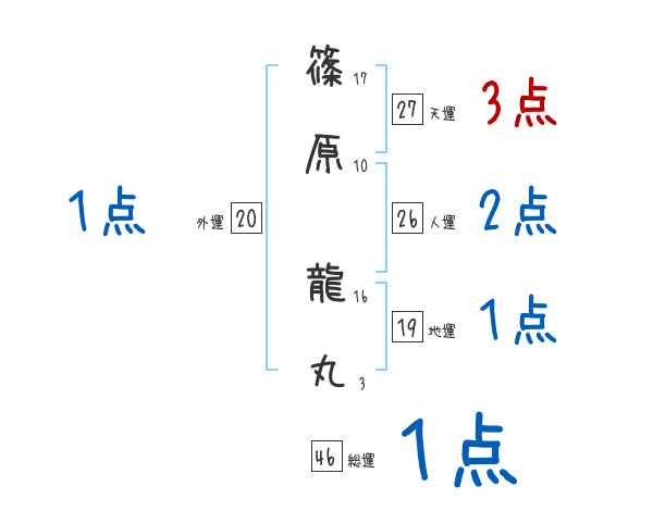 総運![]() | 篠原龍丸さんの総運は46画の1つ星!迷走することが多く苦労するかも。目先のことにとらわれないように。 あなたの人生を表す1番重要な運勢です。生涯を通じて影響する総合運となり、主に50歳以降の晩年期に影響を及ぼします。 |