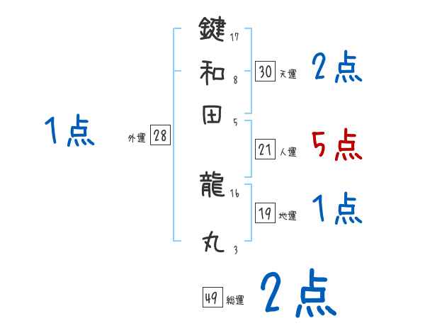 天運![]() | 鍵和田龍丸さんの天運は30画の2つ星!浮き沈みの激しさに注意しましょう。 家系が持つ宿命的な運勢を表します。祖先から受け継いだ苗字ですので自分の力が及びません。家柄を象徴します。 |