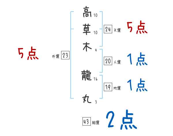 天運![]() | 高草木龍丸さんの天運は24画の5つ星!家庭運が良く順調な人生。金運にも恵まれる。 家系が持つ宿命的な運勢を表します。祖先から受け継いだ苗字ですので自分の力が及びません。家柄を象徴します。 |