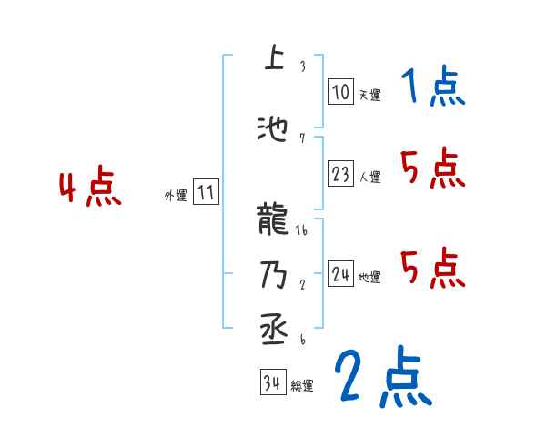 天運![]() | 上池龍乃丞さんの天運は10画の1つ星!不安を感じやすい傾向。ストレスを抱えないように注意しましょう。 家系が持つ宿命的な運勢を表します。祖先から受け継いだ苗字ですので自分の力が及びません。家柄を象徴します。 |