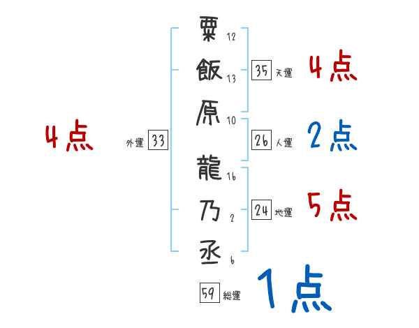 外運![]() | 粟飯原龍乃丞さんの外運は33画の4つ星!権力志向でプライドが高い。勇気があり運を切り開き成功する。 生活面を象徴する運勢です。外部から受ける影響力を表し、結婚運、家庭運や職場、環境への順応性を表します。 |