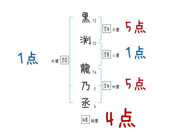 天運![]() | 黒渕龍乃丞さんの天運は24画の5つ星!家庭運が良く順調な人生。金運にも恵まれる。 家系が持つ宿命的な運勢を表します。祖先から受け継いだ苗字ですので自分の力が及びません。家柄を象徴します。 |