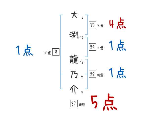 人運![]() | 大渕龍乃介さんの人運は28画の1つ星!家庭環境に注意。スポーツで活躍できる能力があるかも。 性格や才能などを表す2番目に重要な運勢です。人間関係や協調性、社会的な成功に影響します。主に20歳から50歳ぐらいまでの中年期の運勢を表します。 |