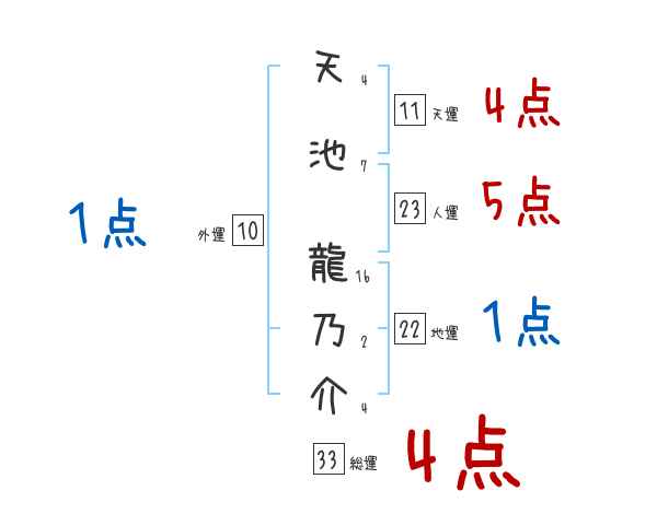 天運![]() | 天池龍乃介さんの天運は11画の4つ星!着実に富や地位を得る幸運な人生。 家系が持つ宿命的な運勢を表します。祖先から受け継いだ苗字ですので自分の力が及びません。家柄を象徴します。 |