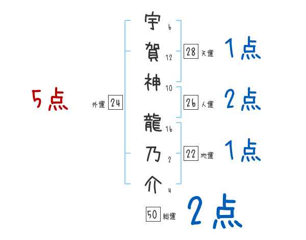 天運![]() | 宇賀神龍乃介さんの天運は28画の1つ星!家庭環境に注意。スポーツで活躍できる能力があるかも。 家系が持つ宿命的な運勢を表します。祖先から受け継いだ苗字ですので自分の力が及びません。家柄を象徴します。 |