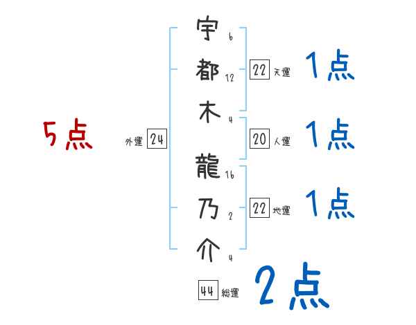 外運![]() | 宇都木龍乃介さんの外運は24画の5つ星!家庭運が良く順調な人生。金運にも恵まれる。 生活面を象徴する運勢です。外部から受ける影響力を表し、結婚運、家庭運や職場、環境への順応性を表します。 |