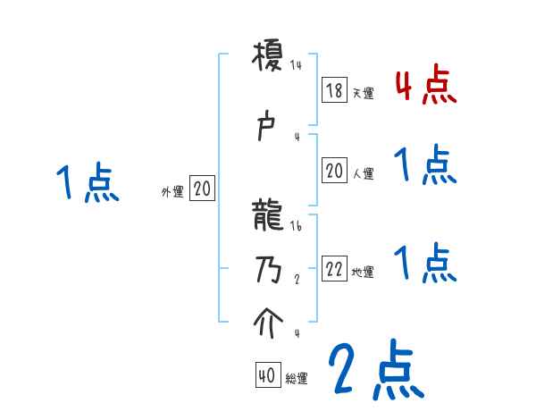 天運![]() | 榎戸龍乃介さんの天運は18画の4つ星!情熱的で剛気。忍耐力があり信頼される。 家系が持つ宿命的な運勢を表します。祖先から受け継いだ苗字ですので自分の力が及びません。家柄を象徴します。 |