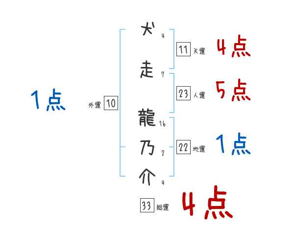 天運![]() | 犬走龍乃介さんの天運は11画の4つ星!着実に富や地位を得る幸運な人生。 家系が持つ宿命的な運勢を表します。祖先から受け継いだ苗字ですので自分の力が及びません。家柄を象徴します。 |
