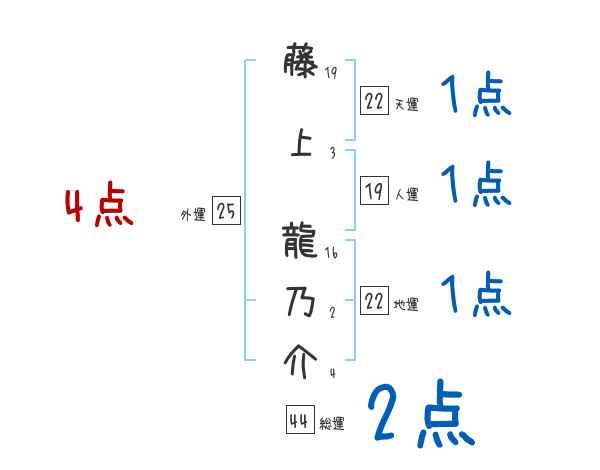 総運![]() | 藤上龍乃介さんの総運は44画の2つ星!誠実で慎重な性格。物事を考えすぎないように注意しましょう。 あなたの人生を表す1番重要な運勢です。生涯を通じて影響する総合運となり、主に50歳以降の晩年期に影響を及ぼします。 |