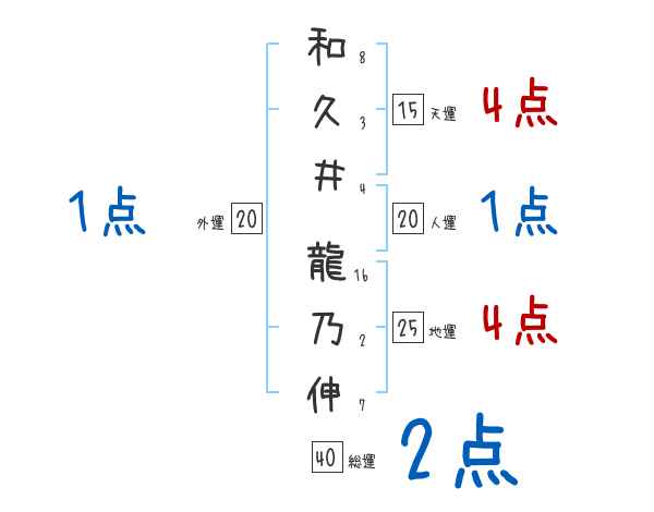 総運![]() | 和久井龍乃伸さんの総運は40画の2つ星!自信過剰で物事に固執するためトラブルに注意。 あなたの人生を表す1番重要な運勢です。生涯を通じて影響する総合運となり、主に50歳以降の晩年期に影響を及ぼします。 |