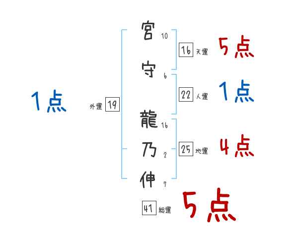 天運![]() | 宮守龍乃伸さんの天運は16画の5つ星!人望が厚く大きく発展する。逆転成功が見える。 家系が持つ宿命的な運勢を表します。祖先から受け継いだ苗字ですので自分の力が及びません。家柄を象徴します。 |