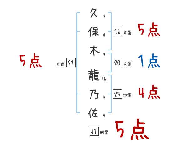 天運![]() | 久保木龍乃佐さんの天運は16画の5つ星!人望が厚く大きく発展する。逆転成功が見える。 家系が持つ宿命的な運勢を表します。祖先から受け継いだ苗字ですので自分の力が及びません。家柄を象徴します。 |