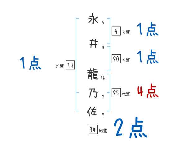 天運![]() | 永井龍乃佐さんの天運は9画の1つ星!消極的で才能を発揮することが苦手なことも。周りの意見に耳を傾けましょう。 家系が持つ宿命的な運勢を表します。祖先から受け継いだ苗字ですので自分の力が及びません。家柄を象徴します。 |