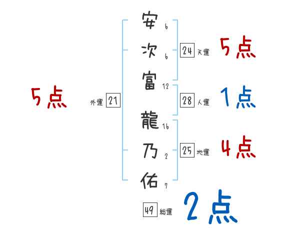 天運![]() | 安次富龍乃佑さんの天運は24画の5つ星!家庭運が良く順調な人生。金運にも恵まれる。 家系が持つ宿命的な運勢を表します。祖先から受け継いだ苗字ですので自分の力が及びません。家柄を象徴します。 |