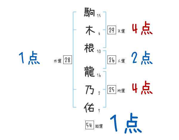 天運![]() | 駒木根龍乃佑さんの天運は29画の4つ星!完全主義で才能がある。厳格な心の持ち主。 家系が持つ宿命的な運勢を表します。祖先から受け継いだ苗字ですので自分の力が及びません。家柄を象徴します。 |