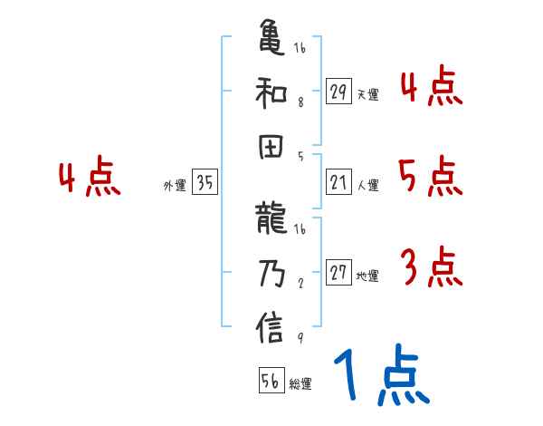 天運![]() | 亀和田龍乃信さんの天運は29画の4つ星!完全主義で才能がある。厳格な心の持ち主。 家系が持つ宿命的な運勢を表します。祖先から受け継いだ苗字ですので自分の力が及びません。家柄を象徴します。 |