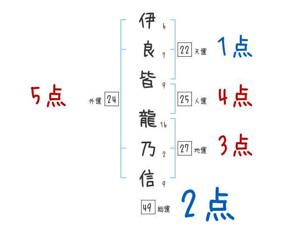地運![]() | 伊良皆龍乃信さんの地運は27画の3つ星!頭脳明晰だが強情で摩擦が多い傾向。孤立に注意。 個性を表す基礎的な運勢です。性格形成や対人関係、行動力など家庭環境に影響されます。主に誕生してから20歳くらいまでの若年期の運勢を表します。 |