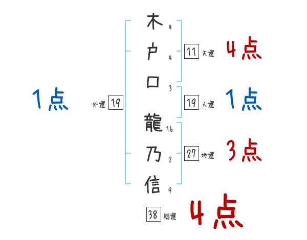 天運![]() | 木戸口龍乃信さんの天運は11画の4つ星!着実に富や地位を得る幸運な人生。 家系が持つ宿命的な運勢を表します。祖先から受け継いだ苗字ですので自分の力が及びません。家柄を象徴します。 |