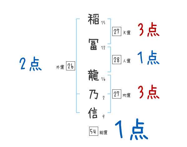 天運![]() | 稲冨龍乃信さんの天運は27画の3つ星!頭脳明晰だが強情で摩擦が多い傾向。孤立に注意。 家系が持つ宿命的な運勢を表します。祖先から受け継いだ苗字ですので自分の力が及びません。家柄を象徴します。 |