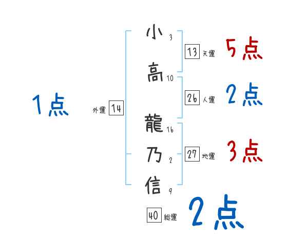 | 天運  | 小高龍乃信さんの天運は13画の5つ星!才能に恵まれ人気がある。名声を手に入れる。円満な人生。家系が持つ宿命的な運勢を表します。祖先から受け継いだ苗字ですので自分の力が及びません。家柄を象徴します。 |