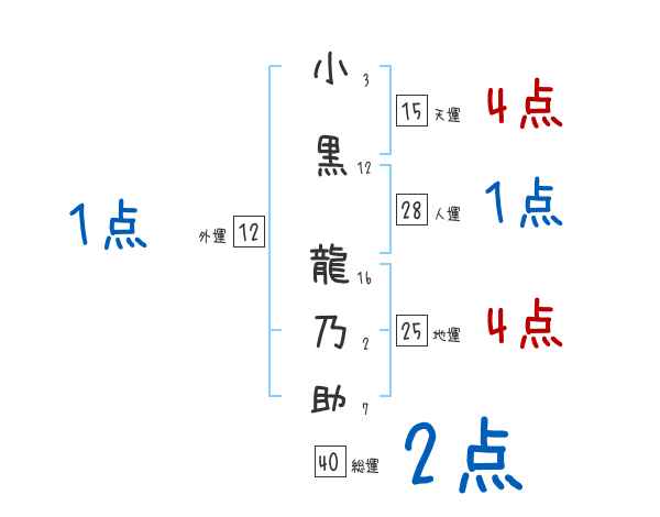 | 天運  | 小黒龍乃助さんの天運は15画の4つ星!人徳があり出世する。順調に物事を進め円満な人生。家系が持つ宿命的な運勢を表します。祖先から受け継いだ苗字ですので自分の力が及びません。家柄を象徴します。 |