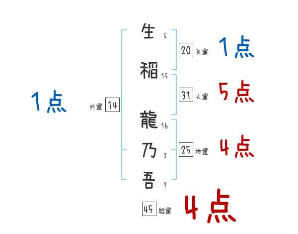 外運![]() | 生稲龍乃吾さんの外運は14画の1つ星!人に対して優しいがストレスを溜め込みがち。人間関係のトラブルを避けるよう気をつけましょう。 生活面を象徴する運勢です。外部から受ける影響力を表し、結婚運、家庭運や職場、環境への順応性を表します。 |