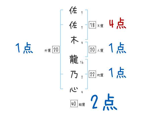 天運![]() | 佐佐木龍乃心さんの天運は18画の4つ星!情熱的で剛気。忍耐力があり信頼される。 家系が持つ宿命的な運勢を表します。祖先から受け継いだ苗字ですので自分の力が及びません。家柄を象徴します。 |