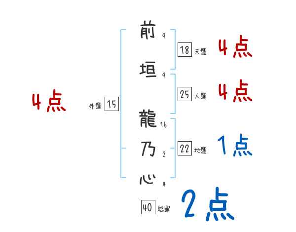 天運![]() | 前垣龍乃心さんの天運は18画の4つ星!情熱的で剛気。忍耐力があり信頼される。 家系が持つ宿命的な運勢を表します。祖先から受け継いだ苗字ですので自分の力が及びません。家柄を象徴します。 |