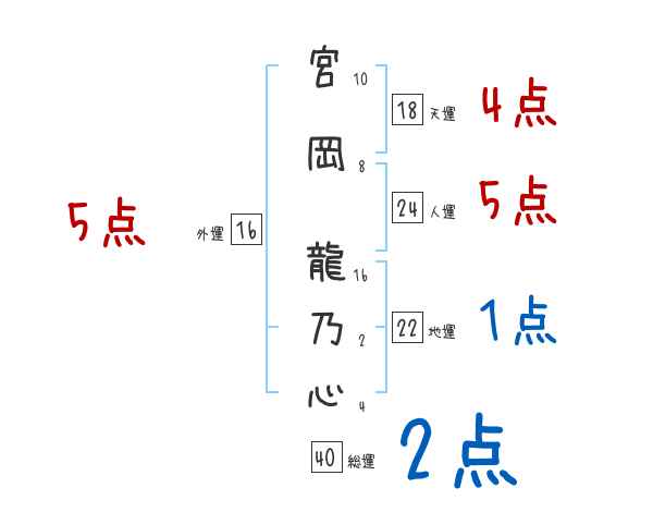 天運![]() | 宮岡龍乃心さんの天運は18画の4つ星!情熱的で剛気。忍耐力があり信頼される。 家系が持つ宿命的な運勢を表します。祖先から受け継いだ苗字ですので自分の力が及びません。家柄を象徴します。 |