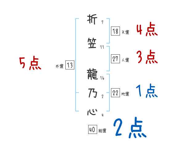 地運![]() | 折笠龍乃心さんの地運は22画の1つ星!努力することが苦手ないっぽう手先が器用。芸術性にも優れる。 個性を表す基礎的な運勢です。性格形成や対人関係、行動力など家庭環境に影響されます。主に誕生してから20歳くらいまでの若年期の運勢を表します。 |